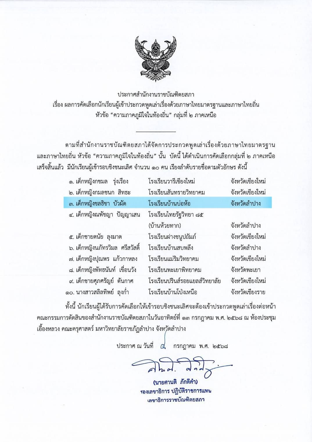 ในการประกวดพูดเล่าเรื่องด้วยภาษาไทยมาตรฐานและภาษาไทยถิ่น หัวข้อ “ความภาคภูมิใจในท้องถิ่น” กลุ่มที่ ๒ ภาคเหนือ