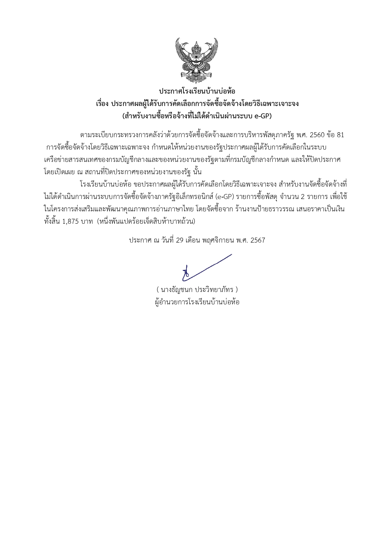 ประกาศผลผู้ได้รับการคัดเลือกการจัดซื้อจัดจ้างโดยวิธีเฉพาะเจาะจง (สำหรับงานซื้อหรือจ้างที่ไม่ได้ดำเนินผ่านระบบ e-GP) โครงการส่งเสริมและพัฒนาคุณภาพการอ่านภาษาไทย