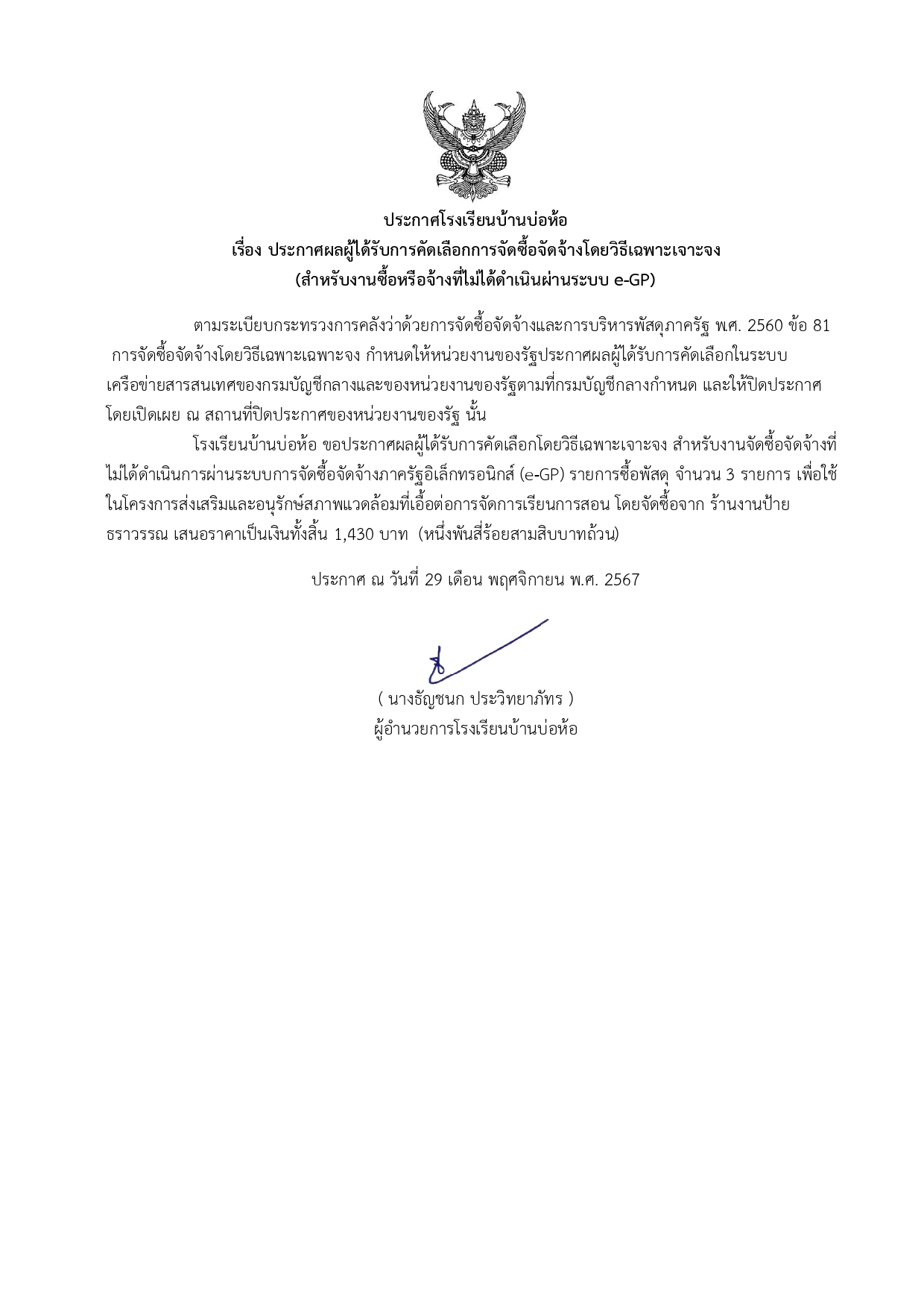 ประกาศผลผู้ได้รับการคัดเลือกการจัดซื้อจัดจ้างโดยวิธีเฉพาะเจาะจง (สำหรับงานซื้อหรือจ้างที่ไม่ได้ดำเนินผ่านระบบ e-GP) โครงการส่งเสริมและอนุรักษ์สภาพแวดล้อมที่เอื้อต่อการจัดการเรียนการสอน