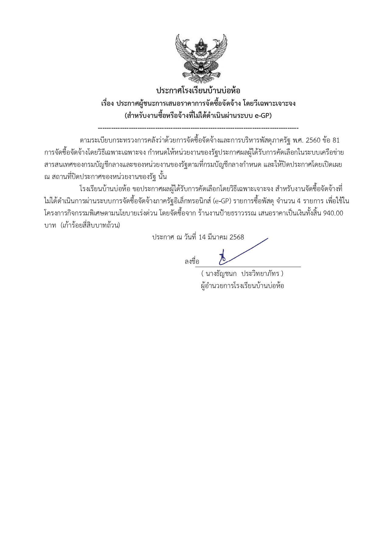ประกาศผลผู้ได้รับการคัดเลือกการจัดซื้อจัดจ้างโดยวิธีเฉพาะเจาะจง (สำหรับงานซื้อหรือจ้างที่ไม่ได้ดำเนินผ่านระบบ e-GP) โครงการกิจกรรมพิเศษตามนโยบายเร่งด่วน